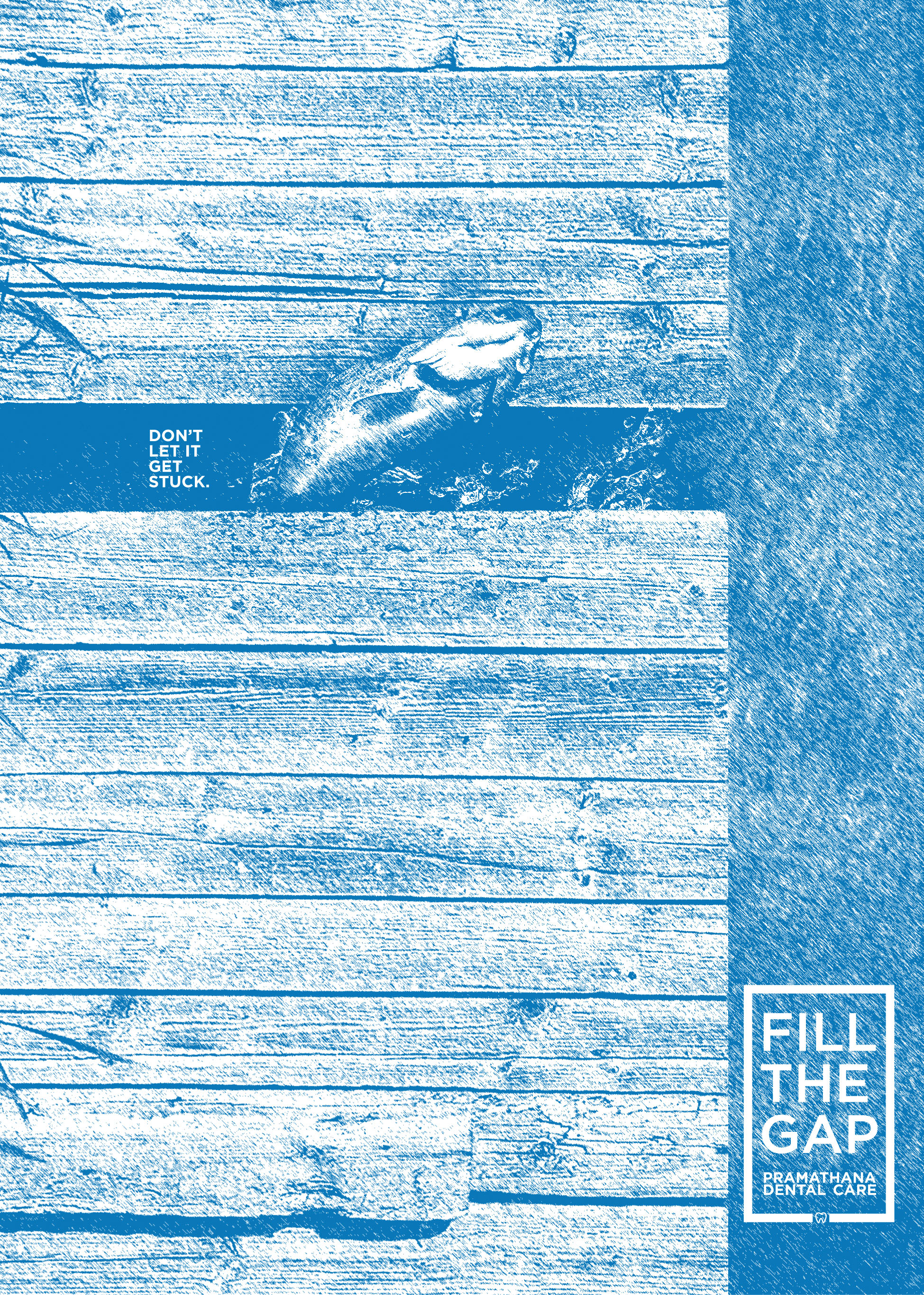 Idea: 'Dont' let it get stuck. Fill the gap'. Pramathana Dental Care offers tooth correction and filling services, so that there are no gaps in your teeth where food can get stuck and cause decay.