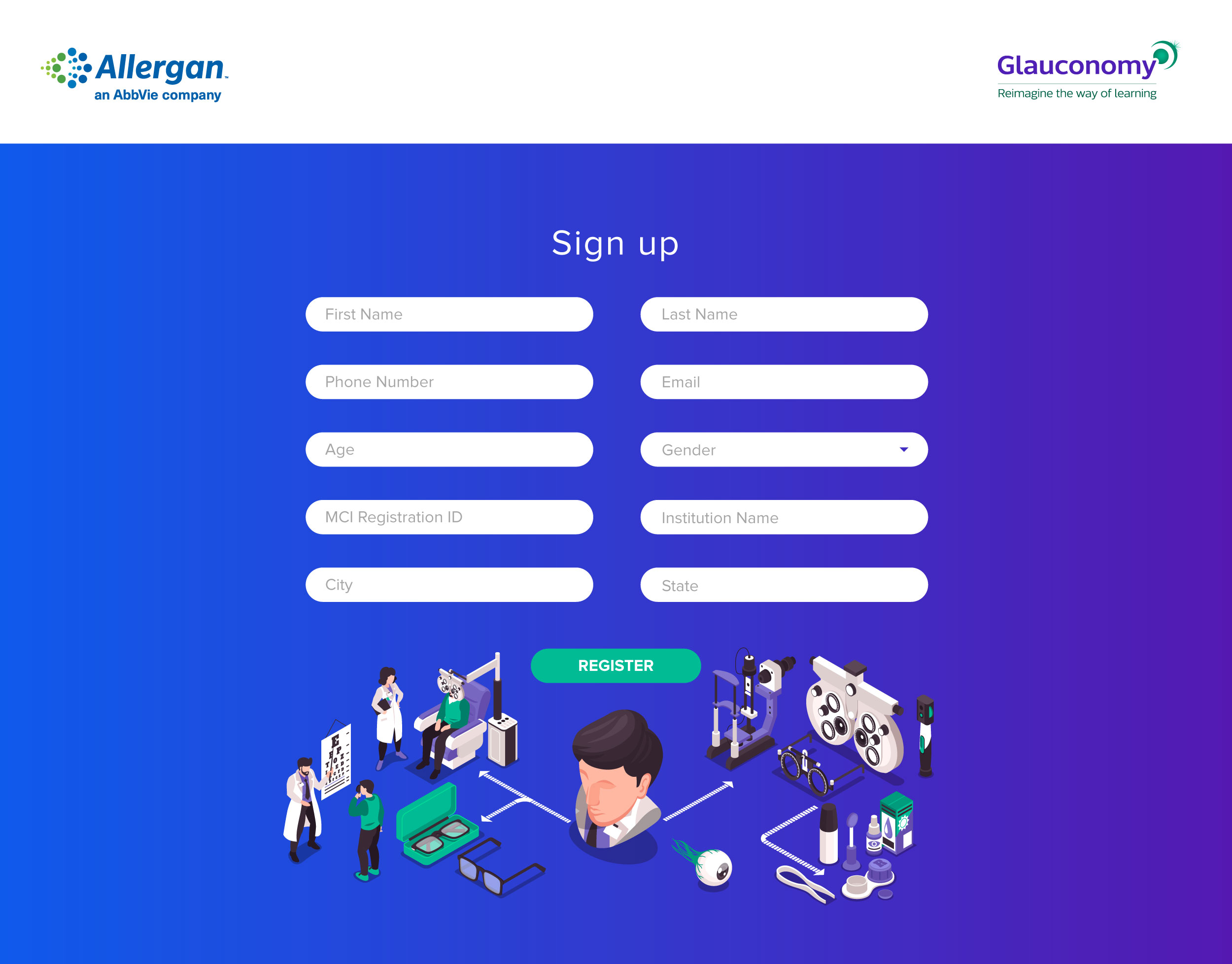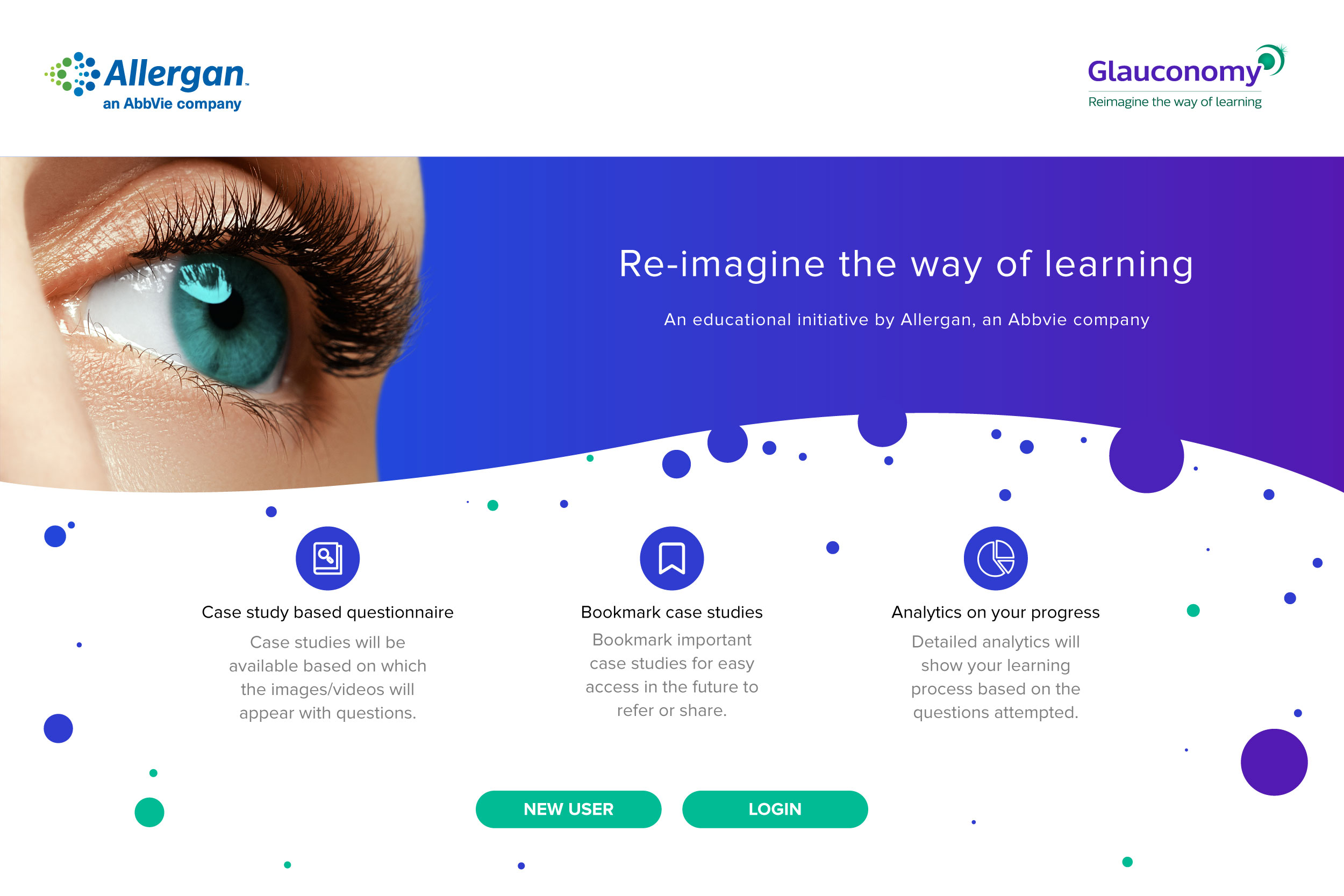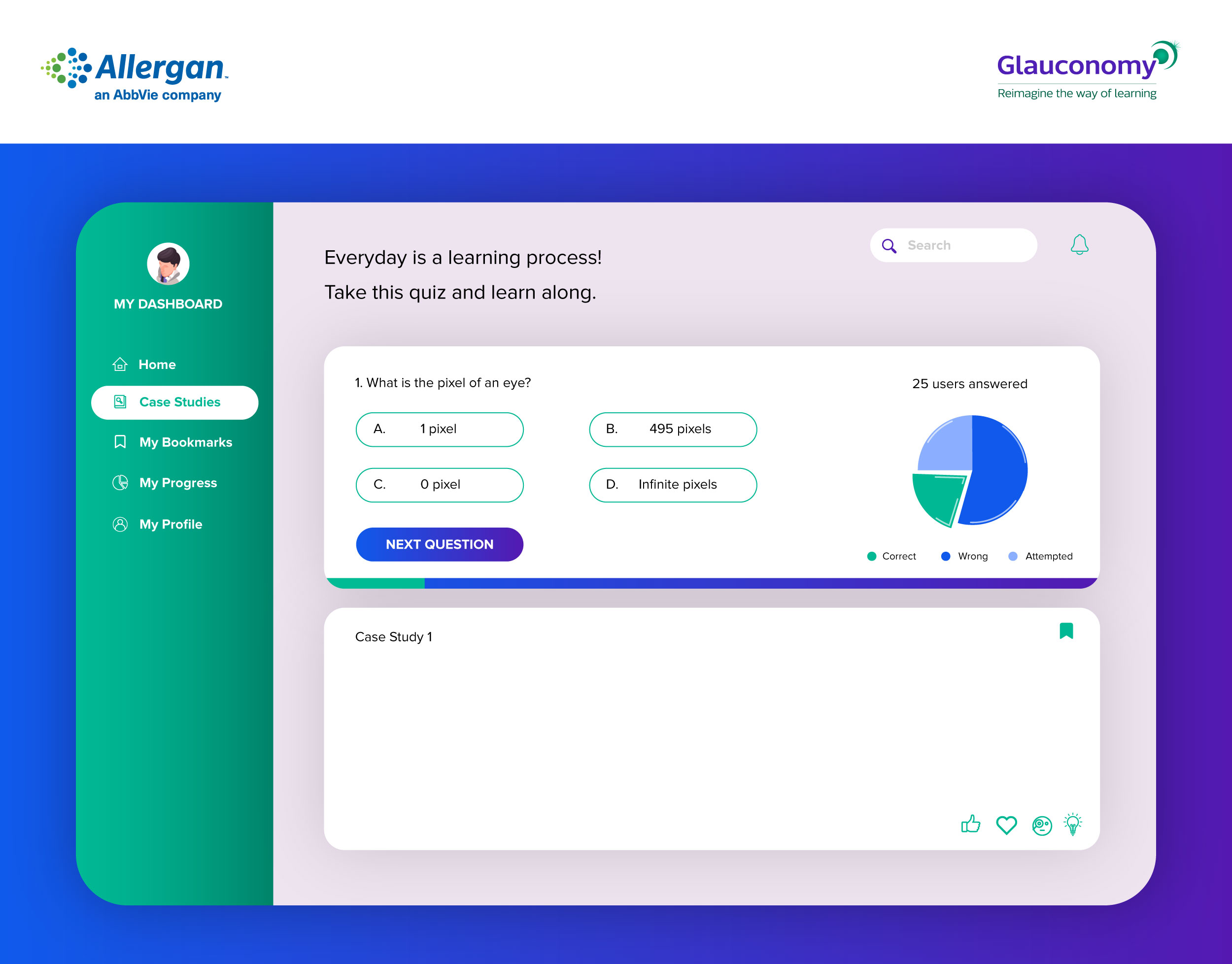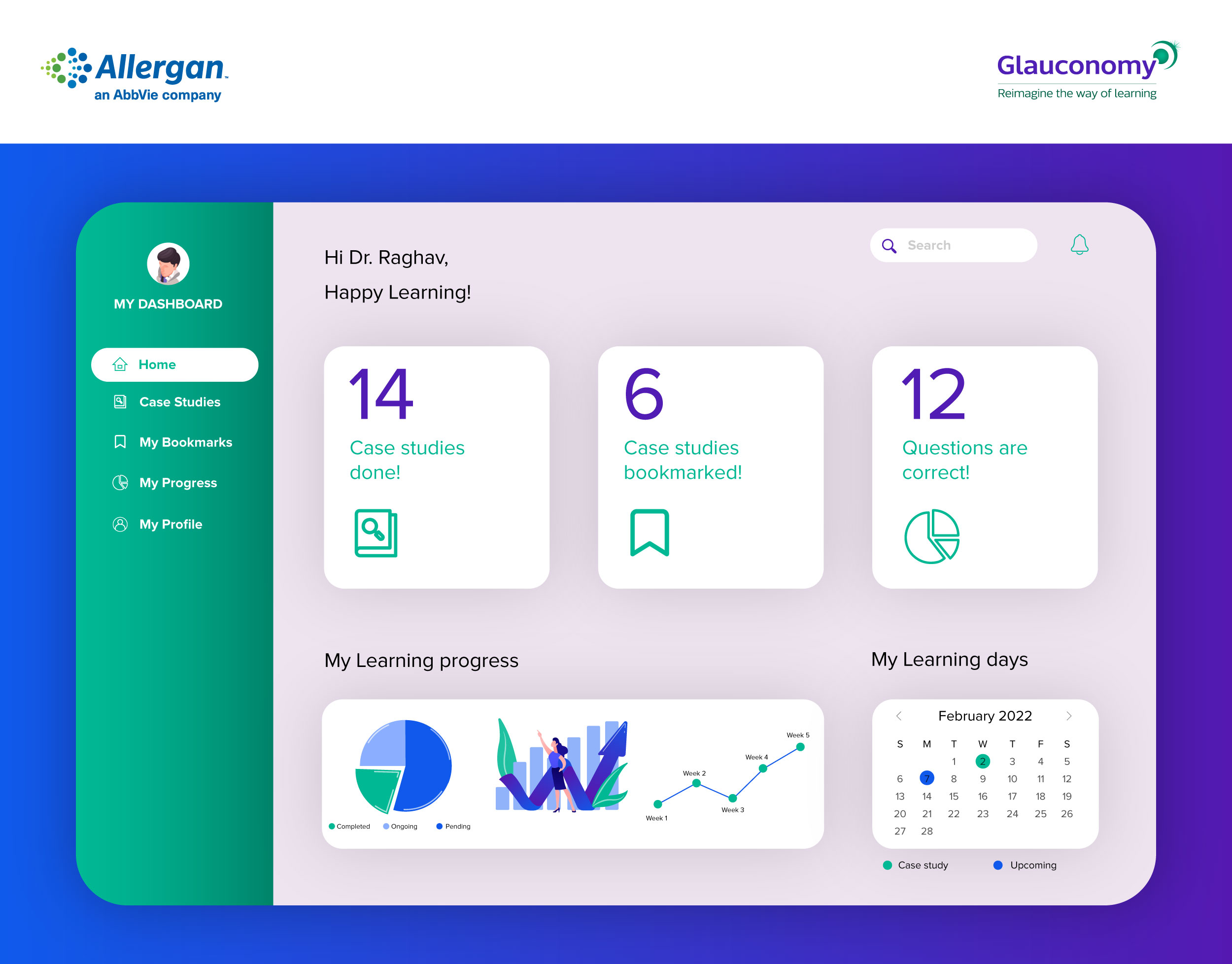 Allergan India launched an educational initiative called Glauconomy to re-imagine the way of learning. The target audience were the students who have just completed post-graduation in Ophthalmology. The quiz application landing page is designed to create awareness of the program and sign up immediately to participate. The UI/UX is executed to navigate easliy and get to know the learning progress through the dashboard. The dashboard consists of case studies with the quiz, learning progress, calendar and other analytics.